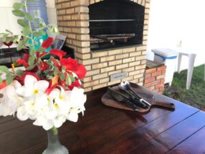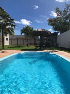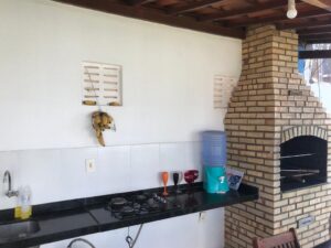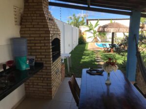 CONDOMÍNIO: Todo cercado, murado e com estacionamento. Gostosa área de lazer com jardim gramado e arborizado, piscina, ducha, espreguiçadeiras, mesas e cadeiras, deck com churrasqueira e 2 banheiros.