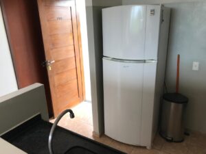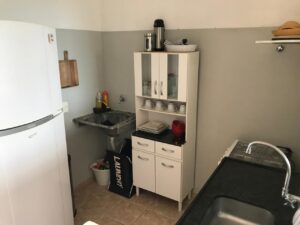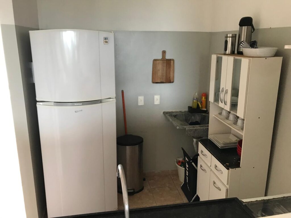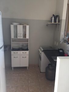 COZINHA: Espaçosa geladeira, fogão com forno 4 bocas, armários com utensílios, tanque.