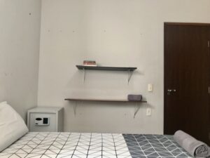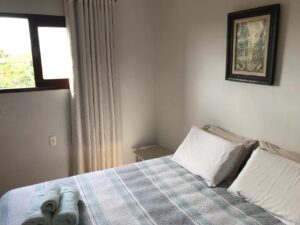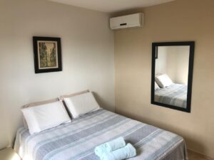 QUARTO 1- Vista para piscina, ar condicionado, cama Queen, prateleiras, cortina blecaute.