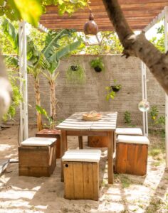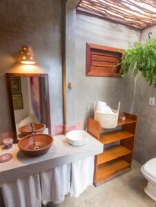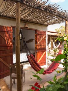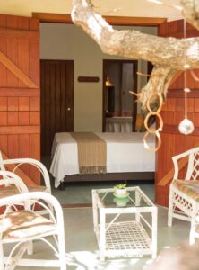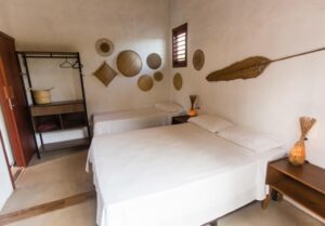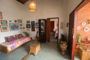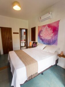 . 1 suite com cama queen que pode acrescentar um colchonete e uma sala com sofá (bicama);