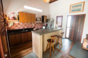 - Cozinha com fogão, microondas, forninho elétrico, geladeira grande.