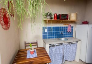Refrigerador; Itens básicos de cozinha; Vasilhas, panelas; óleo; sal e pimenta; Louças e talheres; pratos; copos; Fogão elétrico; Forno Forninho elétrico (pequeno); Torradeira; Liquidificador.