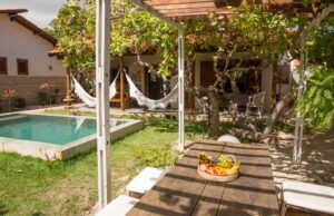 A área externa conta com um lindo espaço verde e arborizado, piscina, ducha externa, mesa de jantar, rede e churrasqueira