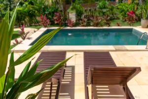 Espaço lounge, piscina e jardim compartilhados com demais hóspedes.