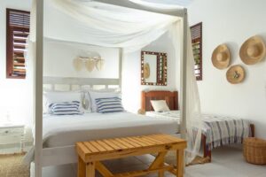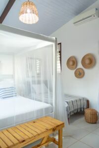 – 1 suíte com 1 cama de casal e 1 cama de solteiro, armário para guardar roupas, ar condicionado e uma bela decoração rústica;