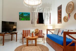 – 1 ampla sala com 1 sofá que pode se transformado em 2 camas de solteiro, 1 TV e uma bela decoração rústica;