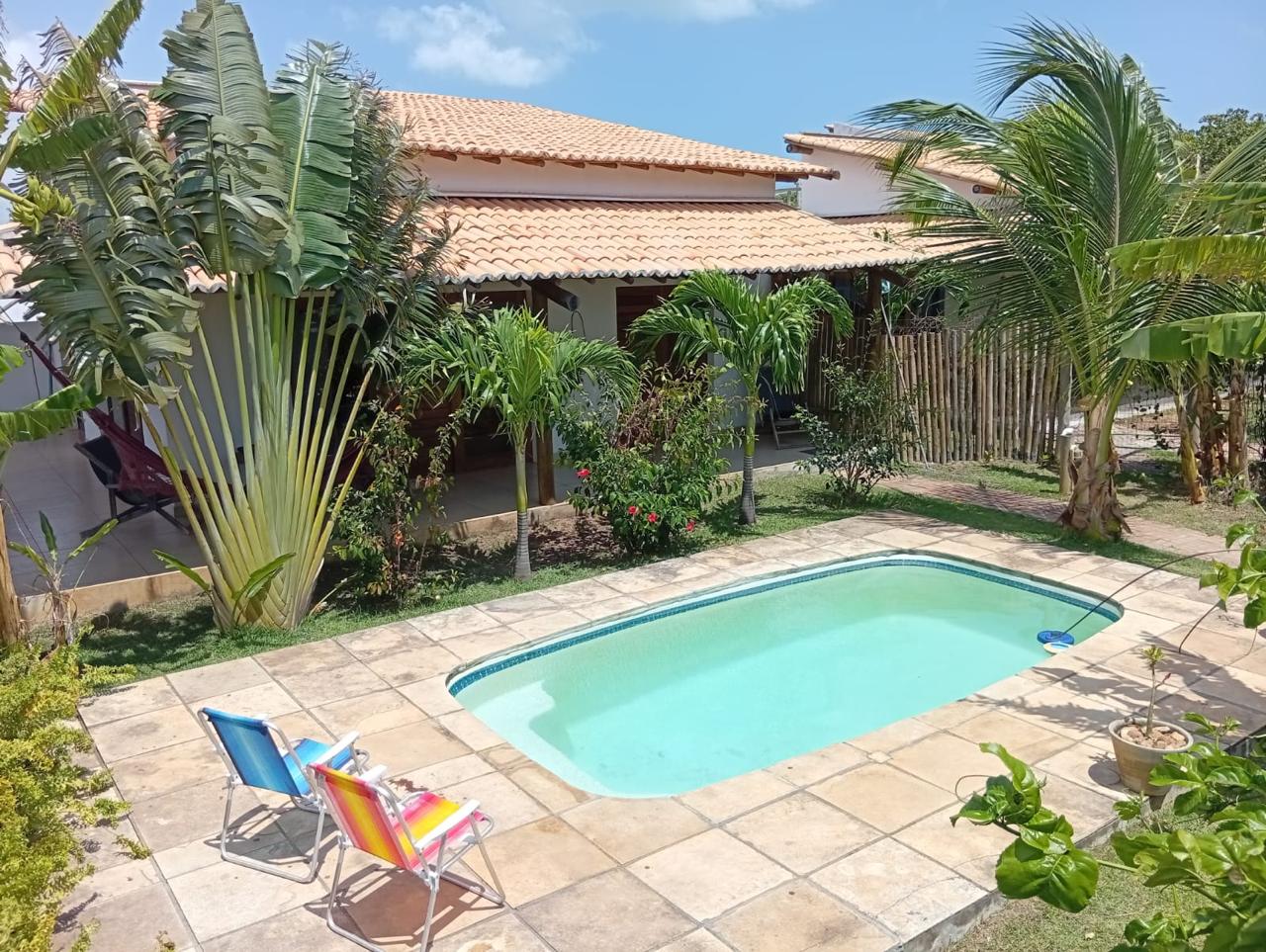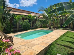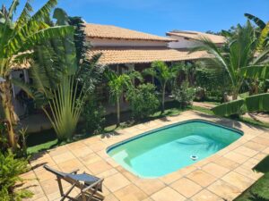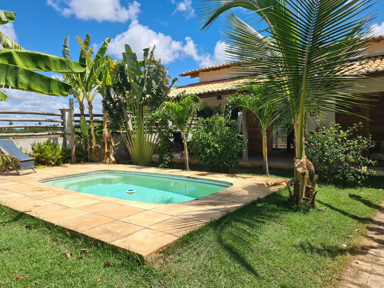 A casa possui uma deliciosa área de lazer com piscina e cercada por um belo jardim. Ideal para famílias, oferece conforto, lazer e um ambiente tranquilo e silencioso.